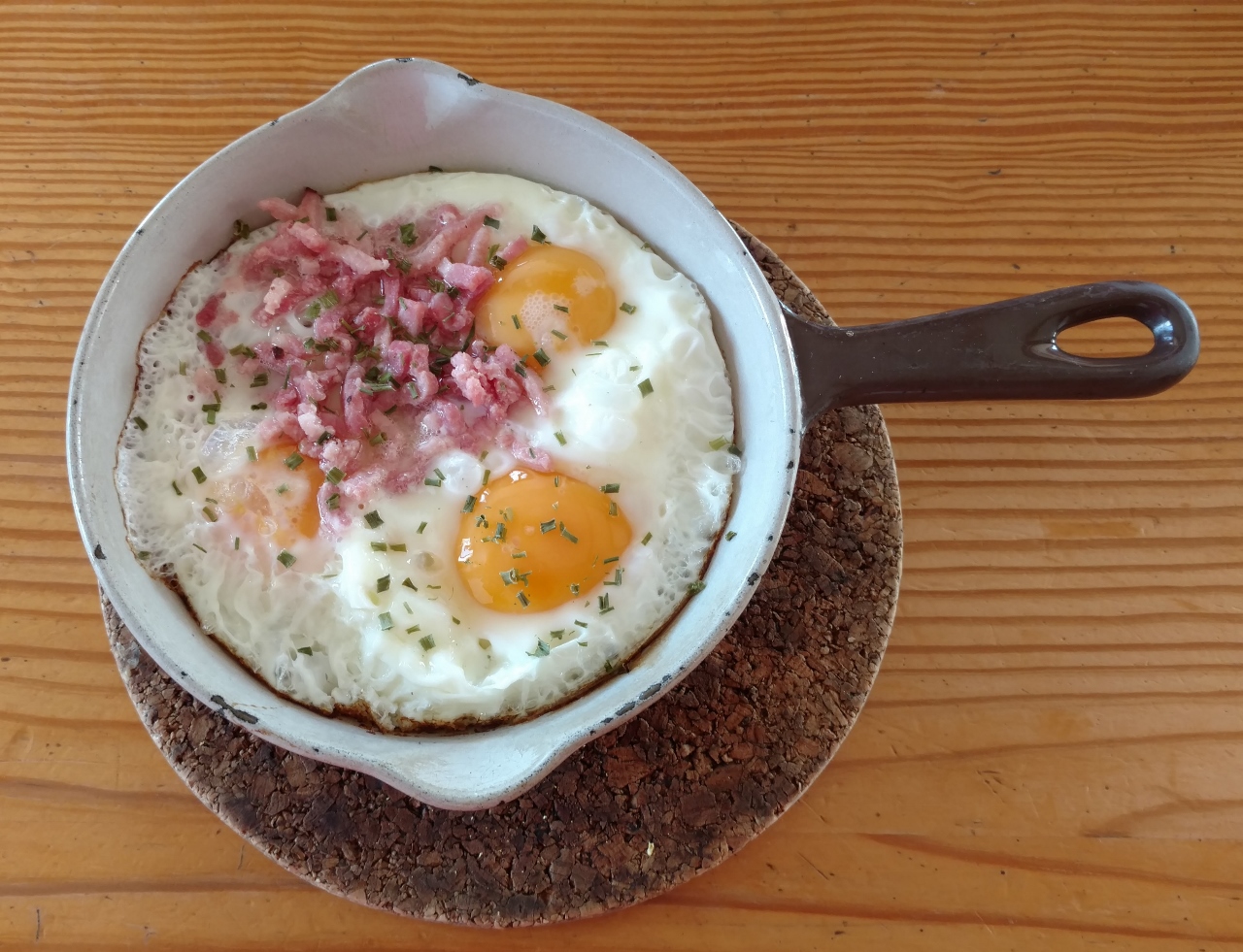 Skillet with two fried eggs topped with chopped ham