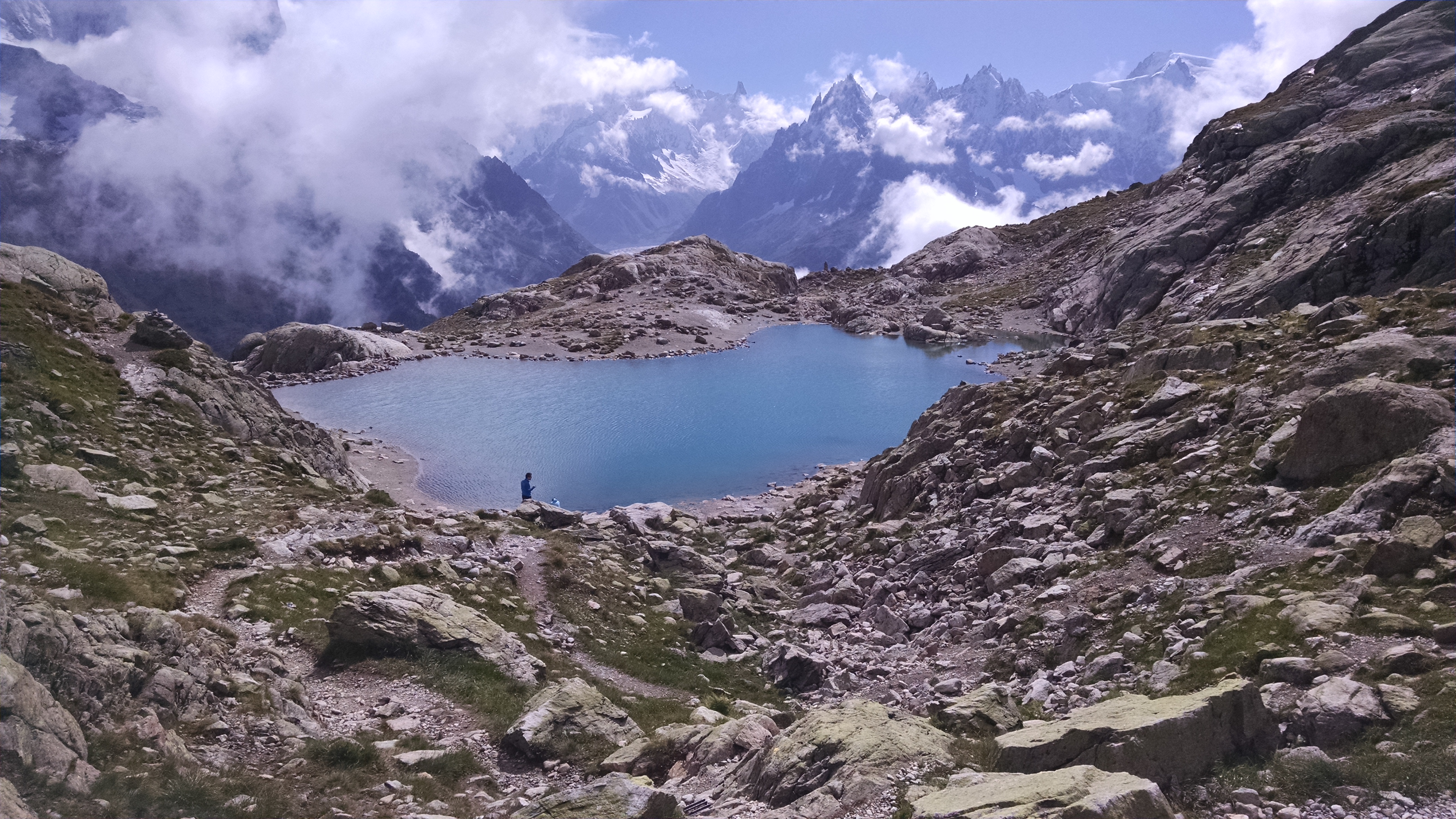 To be able to dine at a trail-side cafe for lunch as we were passing by a refugio at mid-day sounded like a treat. However, I had a little trouble regulating how much food I needed. The first day at Refuge Bel Lachat, not wanting to get too full, I ordered soup, hoping for a thick, hearty soup. Not having any language skills was a hindrance. It was a thin vegetable soup with bread.  At least it was a relatively quick meal. Steve quite enjoyed his salad and charcuterie plate. The next day we stopped at Refuge de Miage, which is in a stunning location at the base of a glacier. We ordered an enormous omelet and felt sluggish afterward. The sun was warm and we relaxed, almost too much. A big outdoor wedding party was being served and after a leisurely lunch we began the protracted process to get our bill. Forty-five minutes later, as dark clouds billowed into the sky, we were still waiting. That was the end of our lunch-time refugio stops. Between the unpredictable amount of food and the need to keep moving when we had long days, refugio lunches didn’t work for us.