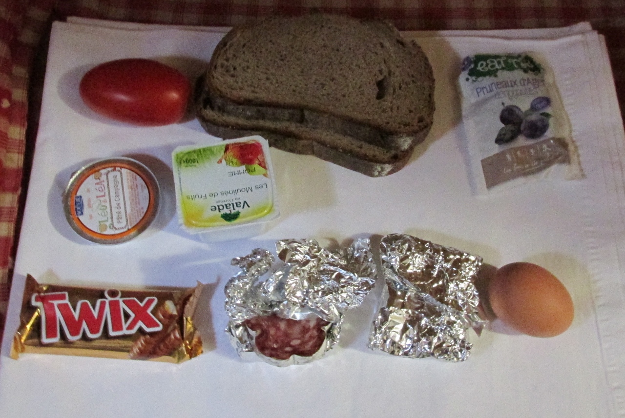 Lunches could be purchased in advance from almost any lodging establishment, including refugios and inns, by ordering the night before. Sack lunches were usually around €12-13 and varied in quality and quantity. One of the best lunches came from Refuge Motetts with an extensive array of items. If I had known how good it would be, I would have ordered a second one for breakfast. It contained a hard-boiled egg, whole tomato, two thick slices of bread, tin of mushroom pate, foil-wrapped packages of sliced salami and cheese, a package of prunes and sweet crackers. This lunch fed two of us for two days, along with some extra crackers the second day, and was well worth the price. Another lunch, from a hotel in La Fouly, was less impressive. It sounded like it was going to be sufficient with two sandwiches, but these turned out to be simply two slices of buttered bread each with the thinnest slice of ham I had ever seen.  That, plus one apple and one small candy bar, was lunch. It was OK with some supplemental cheese, but was disappointing overall.