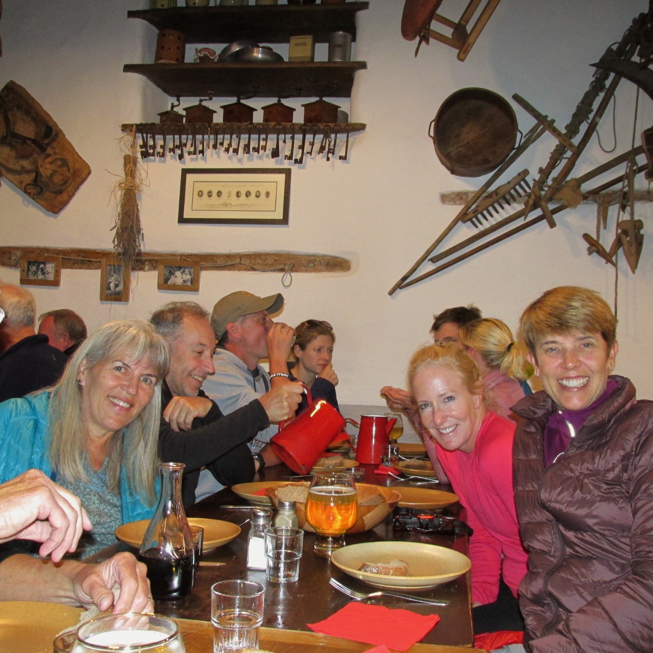 Dinners in the inns were quite nice and were pre-planned (we didn’t order off the menu). Sometimes they had choices, especially for vegetarians. It often started with soup  or salad followed by a main course and dessert, always with excellent flaky bread. The quality was a cut above the refugios and portions were ample. Wine and beer was always available at an extra charge. Dining was generally not communal though we ended up combining tables as we made friends with other trekkers along the way. Some examples of main courses we enjoyed were grilled steak, Asian stir fry, stuffed chicken, curry chicken, perch and risotto. The most unusual salad was a make-your-own type but not at a salad bar. The server brought small glass bowls of sliced beets, cabbage, shredded carrots, beans, chopped tomato and red pepper for the table and we added whatever we wanted to our greens.
